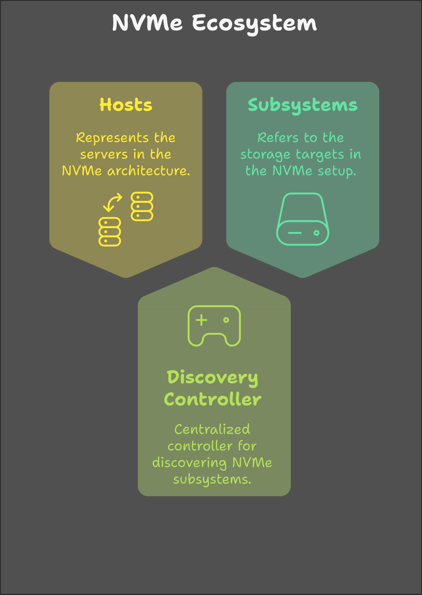 - NVMe Subsystems (Targets): Provide storage volumes.