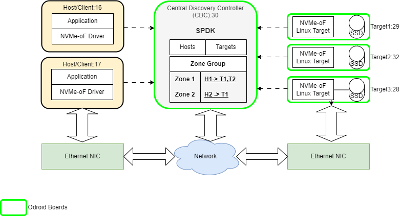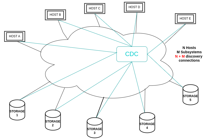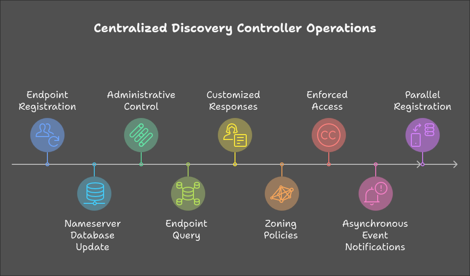 - Centralized Discovery Controller (CDC): Acts as an intermediary, managing connections between hosts and subsystems.