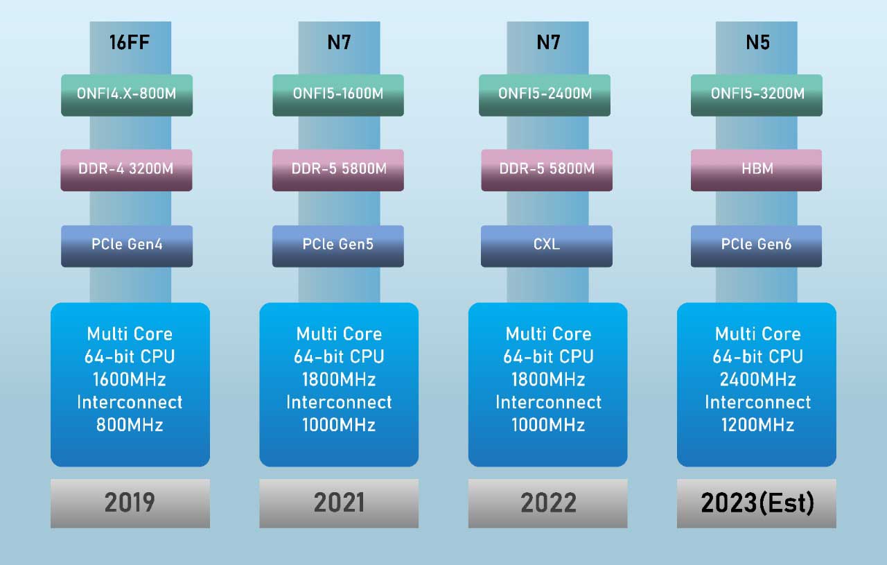 Aaroh Labs has transitioned from 16nm FF to 7nm till 2022. The design involves multi core 64bit CPUs, PCIe Gen4/5, ONFi4/5. Proposed design expected to start early 2023 has CXL and HBM.
